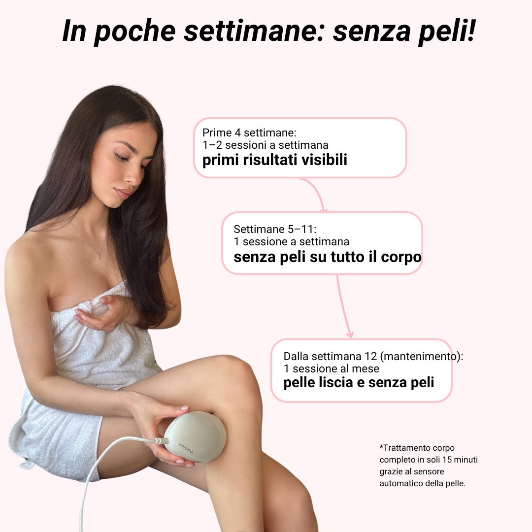 Il trattamento è completamente indolore. Avvertirai al massimo una leggera sensazione di calore sulla pelle—niente pizzicore, niente bruciore, nessuna irritazione cutanea come con altri metodi.