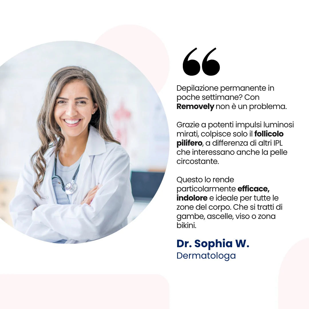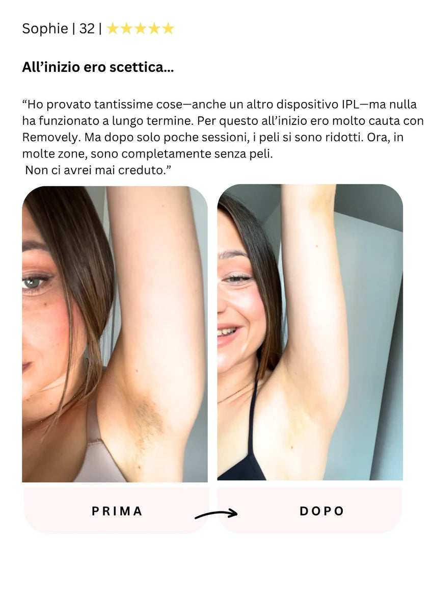 Sì, la tecnologia IPL è clinicamente testata e comprovata. Gli IPL Removely sono progettati per essere sicuri ed efficaci se usati secondo le istruzioni. Per una maggiore sicurezza, il dispositivo è stato controllato da esperti.