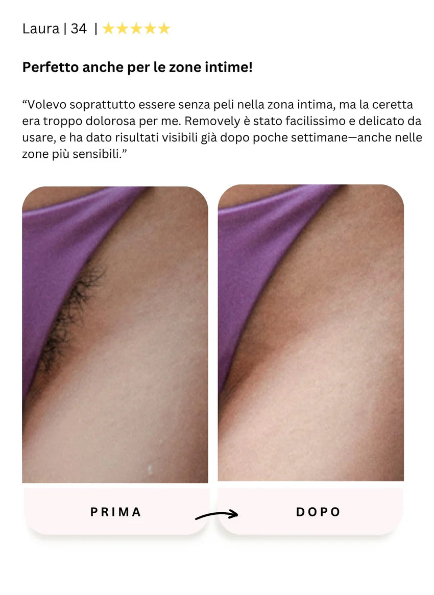 Sì, puoi utilizzare Removely quasi ovunque, anche sul viso e nelle zone sensibili come la zona bikini. Evita però l’applicazione sui genitali, sugli occhi, sui tatuaggi o su ferite aperte.