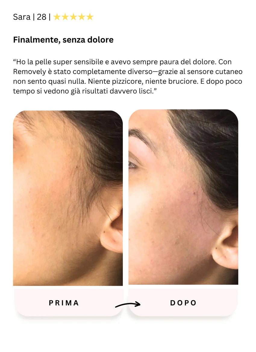 Il trattamento è completamente indolore. Avvertirai al massimo una leggera sensazione di calore sulla pelle—niente pizzicore, niente bruciore, nessuna irritazione cutanea come con altri metodi.